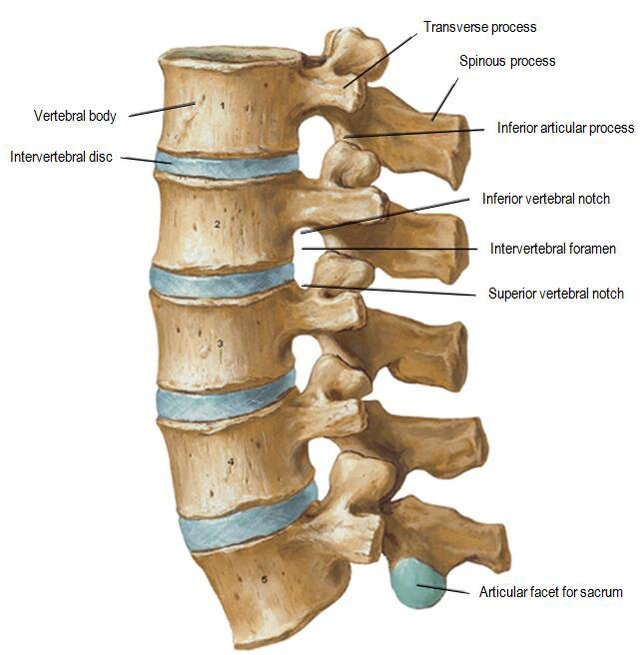 Donji deo leđa (slabinski/lumbalni) čini 5 pršljenova koji se obeležavaju slovima L1 do L5 i oni služe da „nose“najveći deo tereta našeg tela. U sklopu celog kičmenog stuba (uz neke izuzetke vratnih pršljenova i trtične kosti) a između svakog pršljena, nalaze se diskovi tj mekani „jastučići“ koji nam služe, pre svega kako bi napravili distancu između dva pršljena, ali i imaju ulogu da omoguće pokrete kičmenog stuba kao i da amortizuju udare koje kičmeni pršljenovi trpe na primer prilikom bavljenja sportskim aktivnostima i aktivnostima dnevnog života. Pršljenovi su povezani između sebe i odreženim ligamentima između svakog pršljena a njihovu stabilizaciju omogućavaju i okolni mišići.